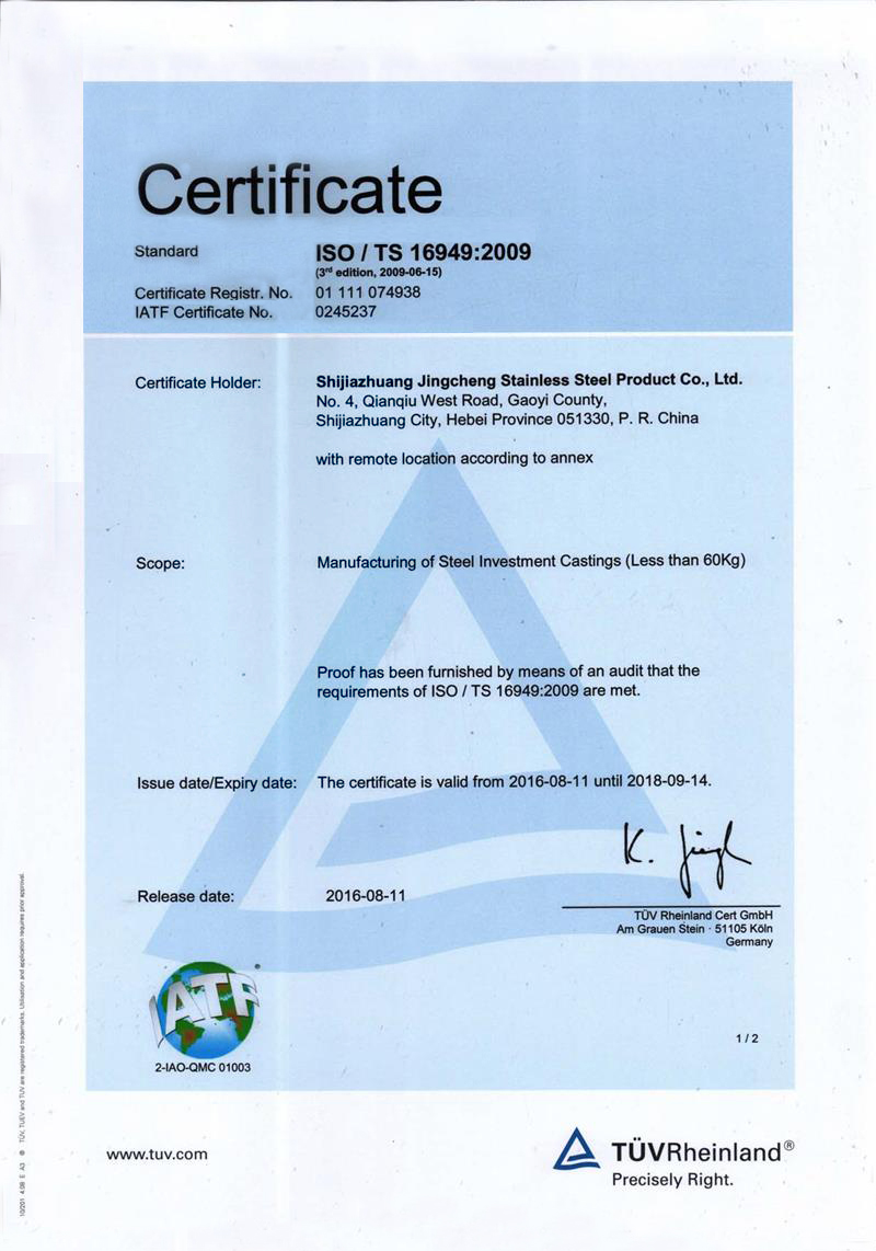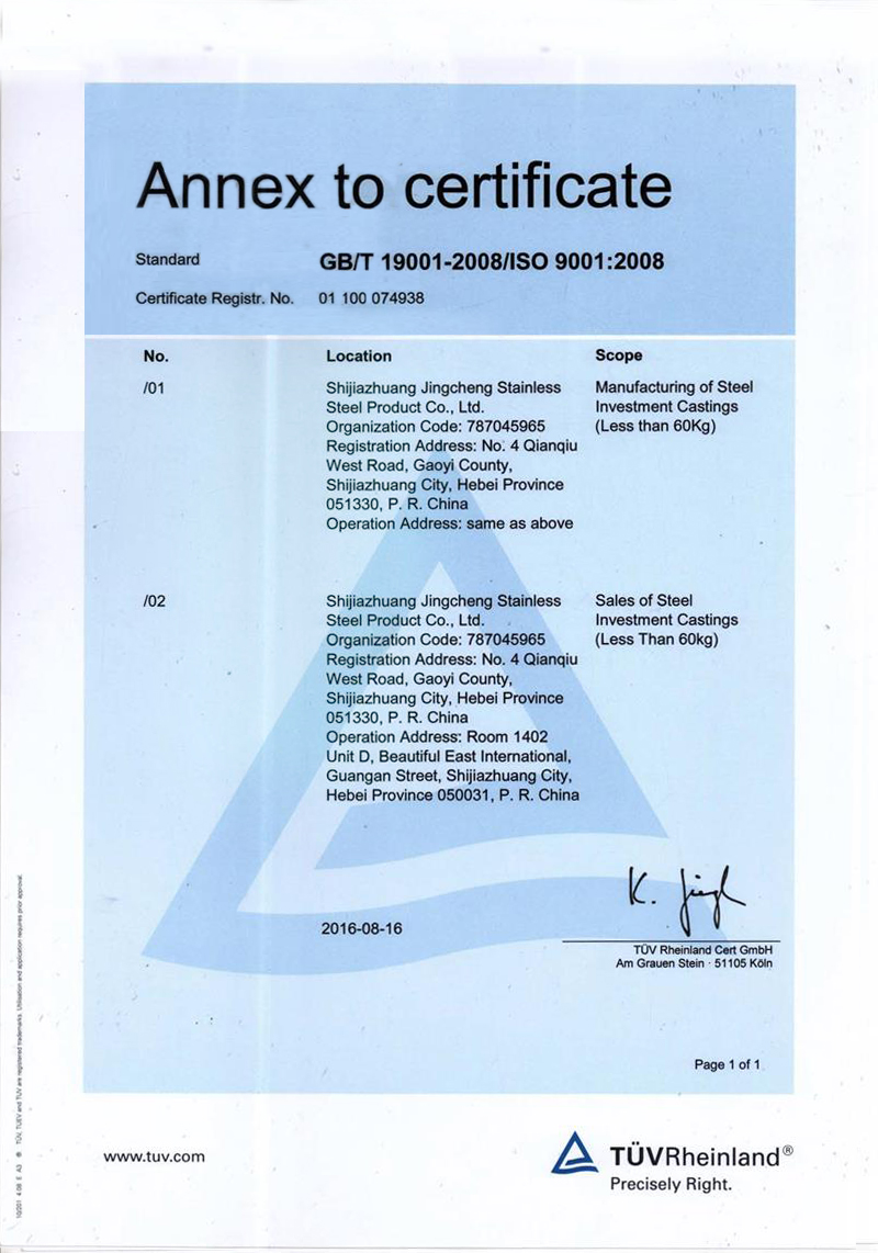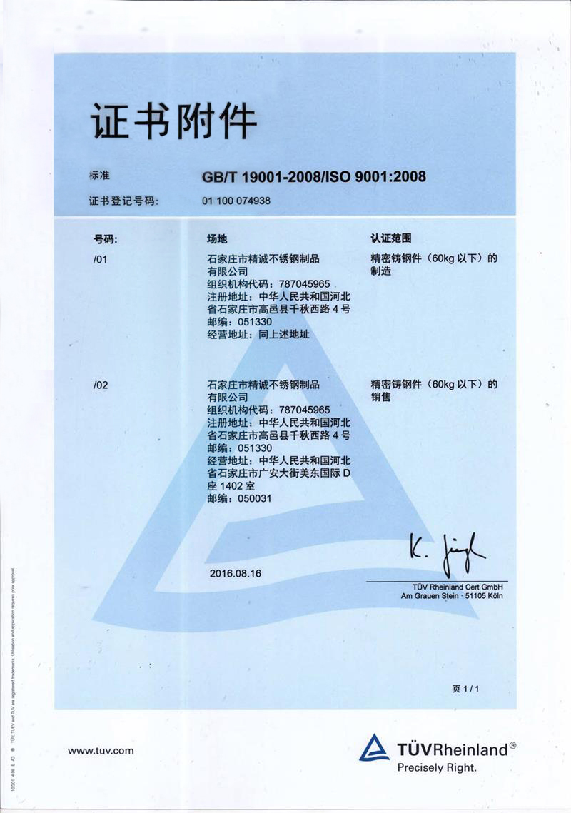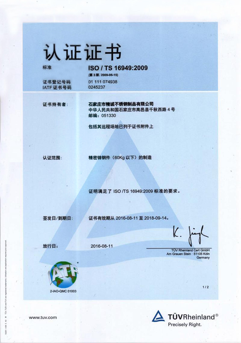 石家莊市精誠(chéng)不銹鋼制品有限公司,是一家從事專(zhuān)業(yè)精密鑄造的企業(yè)。主要生產(chǎn)不銹鋼、合金鋼、低碳鋼及各種特種合金材質(zhì)的精密鑄件及加工產(chǎn)品。